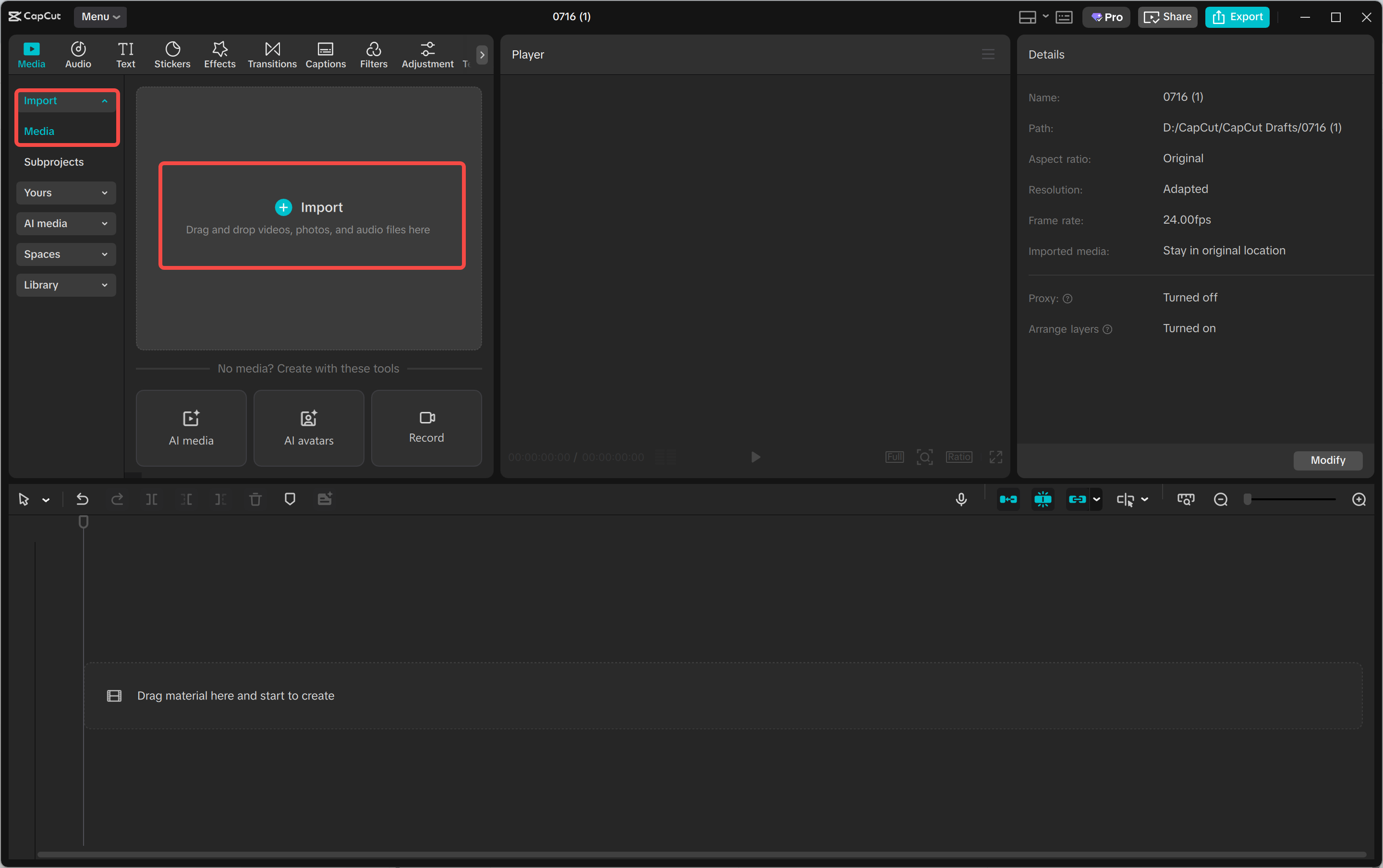 Klikněte na „Importovat“ pro nahrání svých video klipů a zvukových stop do editoru CapCut. Ať už jde o záznam koncertu, taneční vystoupení nebo scénickou montáž, můžete snadno přetahovat své média na časovou osu.
