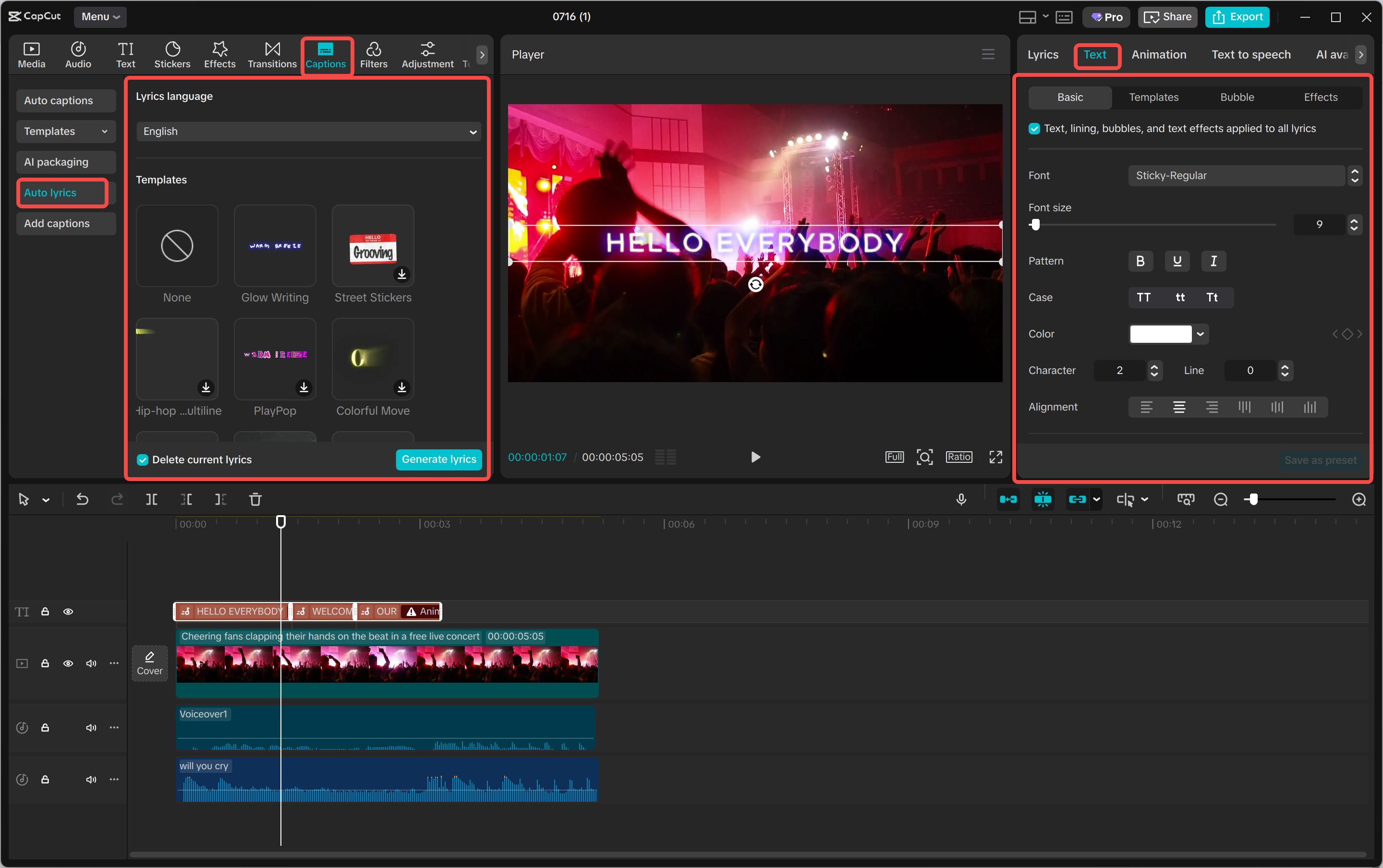 Funkce automatických titulků od CapCutu vám pomůže rychle převést vaši hudbu nebo vokály na editovatelný text. Ideální pro proměnění záznamů z hlavní scény Lollapaloozy na zvýrazněné klipy s titulky. Tato funkce je k dispozici v nástroji na titulky CapCut pro hudbu i mluvené audio.