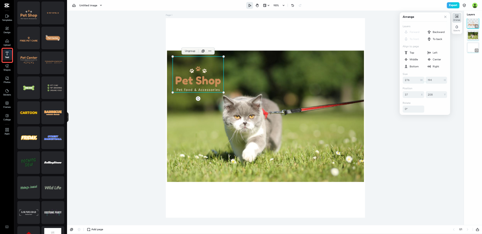 Wählen Sie aus einer Reihe von Schriftarten, Größen, Farben und Effekten, um Ihren Text wirklich hervorzuheben. Sie können auch mit anderen Elementen, wie z. B. Aufkleberformen, spielen und deren Positionen anpassen, bis Sie die perfekte Komposition erreicht haben.