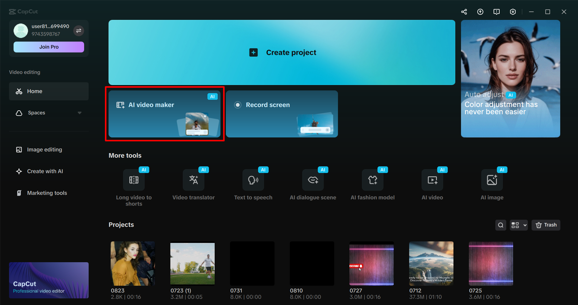 Öffnen CapCut und wählen Sie "AI video maker" auf der Homepage, um mit der Erstellung Ihrer Anzeige zu beginnen.