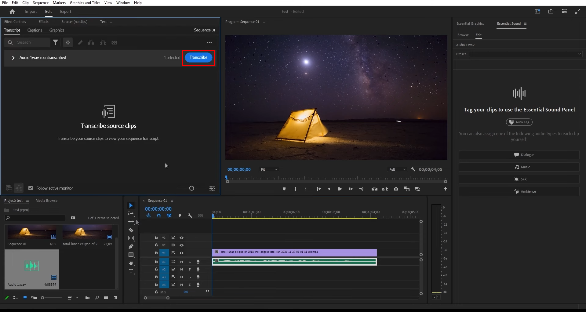 Sobald Sie Ihr Filmmaterial neu formatiert haben, ist es an der Zeit, es zu optimieren. Öffnen Sie das Text-Panel und klicken Sie auf „Sequenz transkribieren“. Die KI von Premiere Pro generiert automatisch Untertitel für Ihr Video, die Sie nach Ihren Wünschen bearbeiten und gestalten können. Um Ihre Audioqualität zu verbessern, wählen Sie den Clip aus und gehen Sie zu „Essential Sound“. Hier können Sie die Option „Sprache verbessern“ nutzen, um die Dialogklarheit zu optimieren. Sie können auch die Farbeinstellungen über das Lumetri-Panel anpassen. Wählen Sie einfach einen Referenzrahmen aus, und Premiere Pro passt die Farben automatisch für Ihre Aufnahmen an.