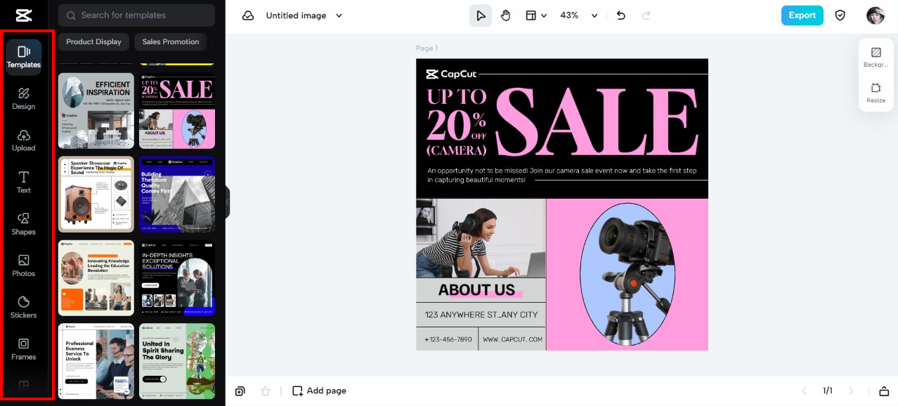 Außerdem ist CapCut das praktischste Werkzeug, wenn es um die Bildbearbeitung geht. Sie können die Größe von JPEG-Bildern mühelos mit CapCutändern, Farbverbesserungen vornehmen, grundlegende Bearbeitungen vornehmen oder voreingestellte Bildvorlagen verwenden.