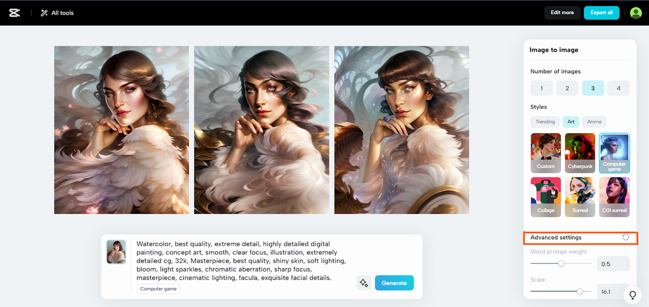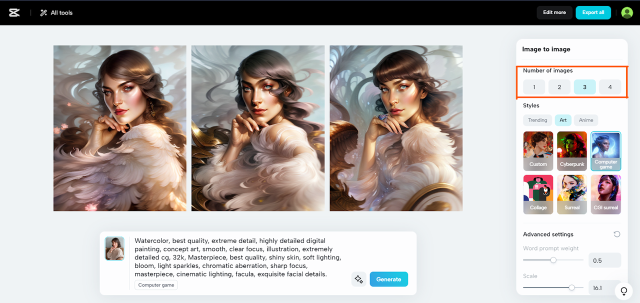Revise las imágenes de anime generadas y vea cuál le resuena con . Si necesita ajustar, ahora es el momento de aplicar los toques finales con CapCut