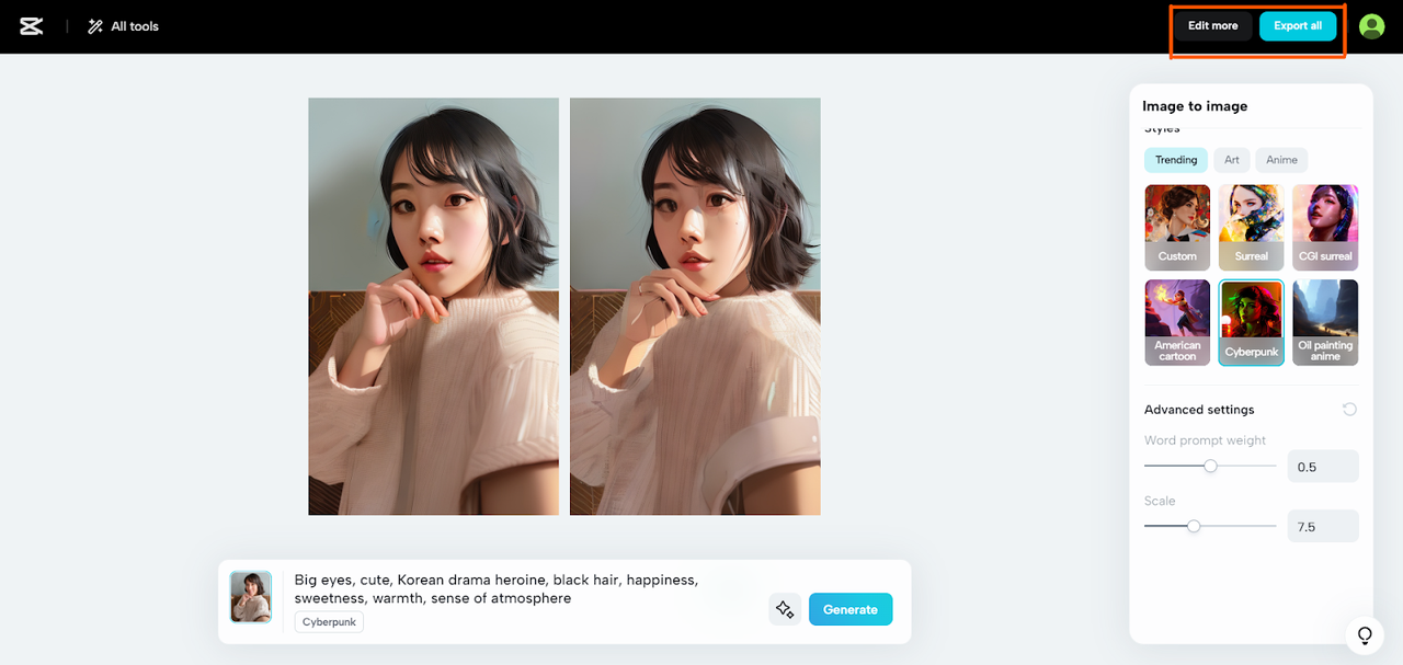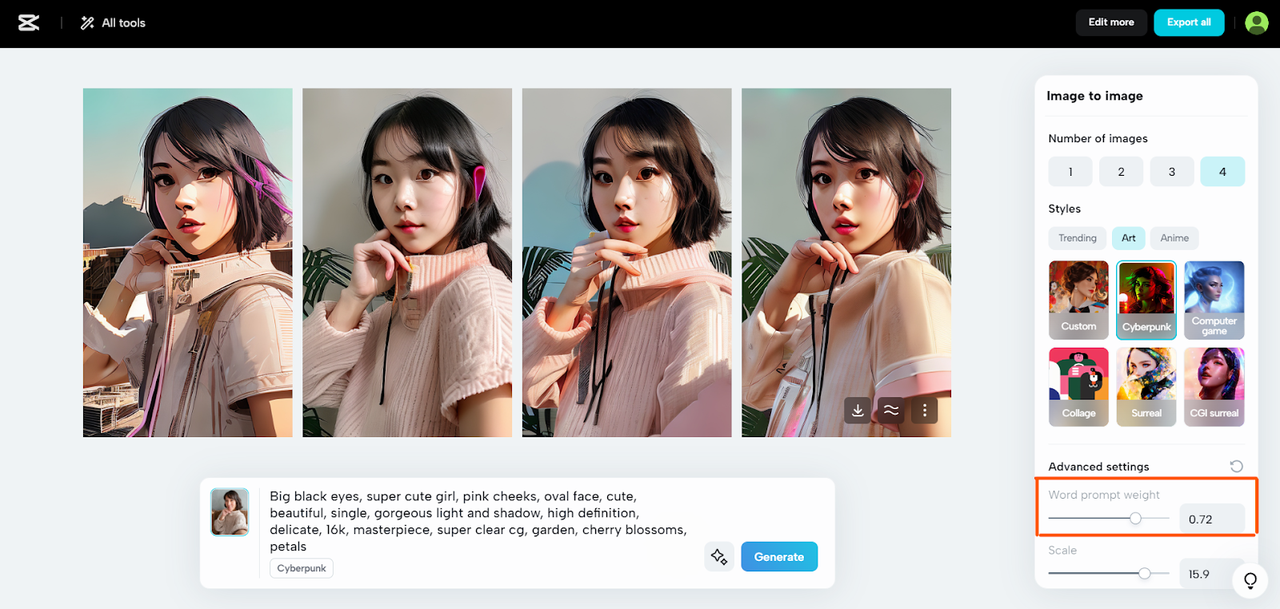 Para el "Peso del indicador de palabra", posicionarlo en 0,72 equilibra la influencia de su texto descriptivo con las señales visuales de su foto. Un valor más alto haría que el indicador de texto fuera más dominante en la guía del proceso de transformación de la IA. Con sus preferencias, haga clic en 'Generar'. En tres segundos, CapCut imagen a imagen hará su magia, transformando tu selfie en anime.