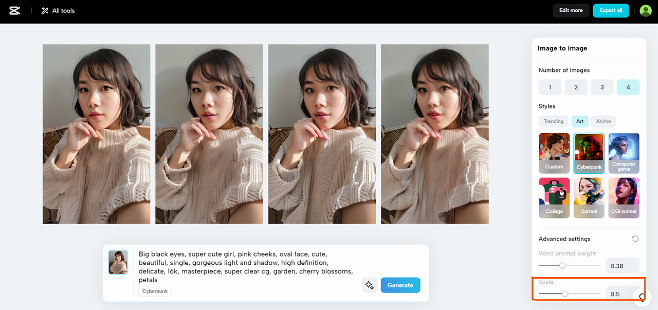La función 'Escala' es donde CapCutla magia realmente se desarrolla. Piense en ello como su deslizador hacia la autenticidad del anime. Deslizarse hacia la derecha aumenta cuánto su imagen final se hará eco de la foto de referencia y el mensaje de texto que proporcionó. Es como decirle a la IA: "Mantén esta vibra, pero hazlo anime". Para aquellos que quieran un guiño sutil al anime, manténgalo más cerca del medio. Se trata de encontrar ese punto dulce en el control deslizante que traduce tu selfie en un avatar de anime que se sienta bien.