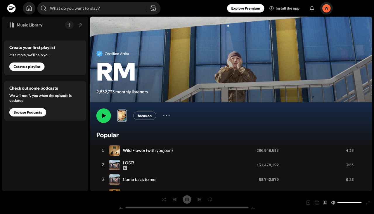 RM, pemimpin BTS, dikenal karena musiknya yang dalam dan bijaksana. Lagu solonya sering mengeksplorasi tema identitas, kesuksesan, dan refleksi diri. Kemampuannya menggabungkan lirik puitis dengan ketukan halus membuat musiknya menonjol. Sebagai seorang rapper dan penulis lagu, ia telah mendapatkan jutaan streaming di Spotify, menginspirasi penggemar dengan penceritaan dan artisnya yang jujur.