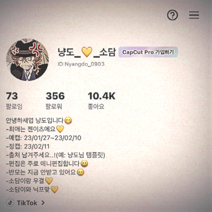 냥도안녕하세엽 냥도입니다😋 -템플릿 사용은 당연히 가능합니다!💛 -최애는 젠이츠에요💛 -장르가 계속 다양해집니다ㅋㅋ하지만 씹덕은 아니에요 다 유명해서!😅 -예캡: 23/01/27~23/02/10 -정캡: 23/02/11 -출처 남겨주세요..!(예: 냥도님 템플릿) -편집은 주로 애니편집합니다😆 -반모는 지금 안받고 있어요🥲 -소담이랑 우결💛