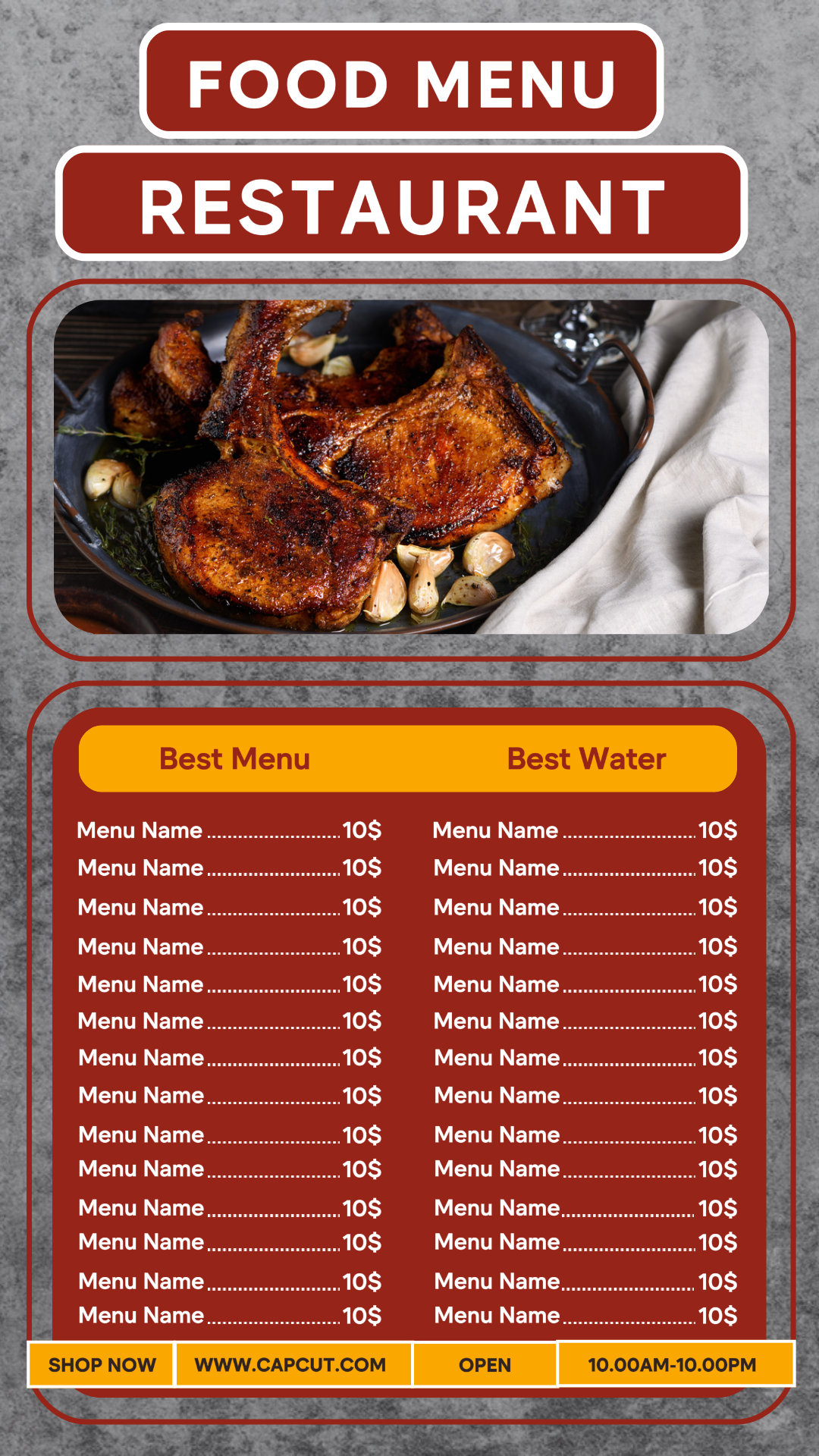 A minimalist steak food menu with a chocolate theme can be edited for Instagram Stories