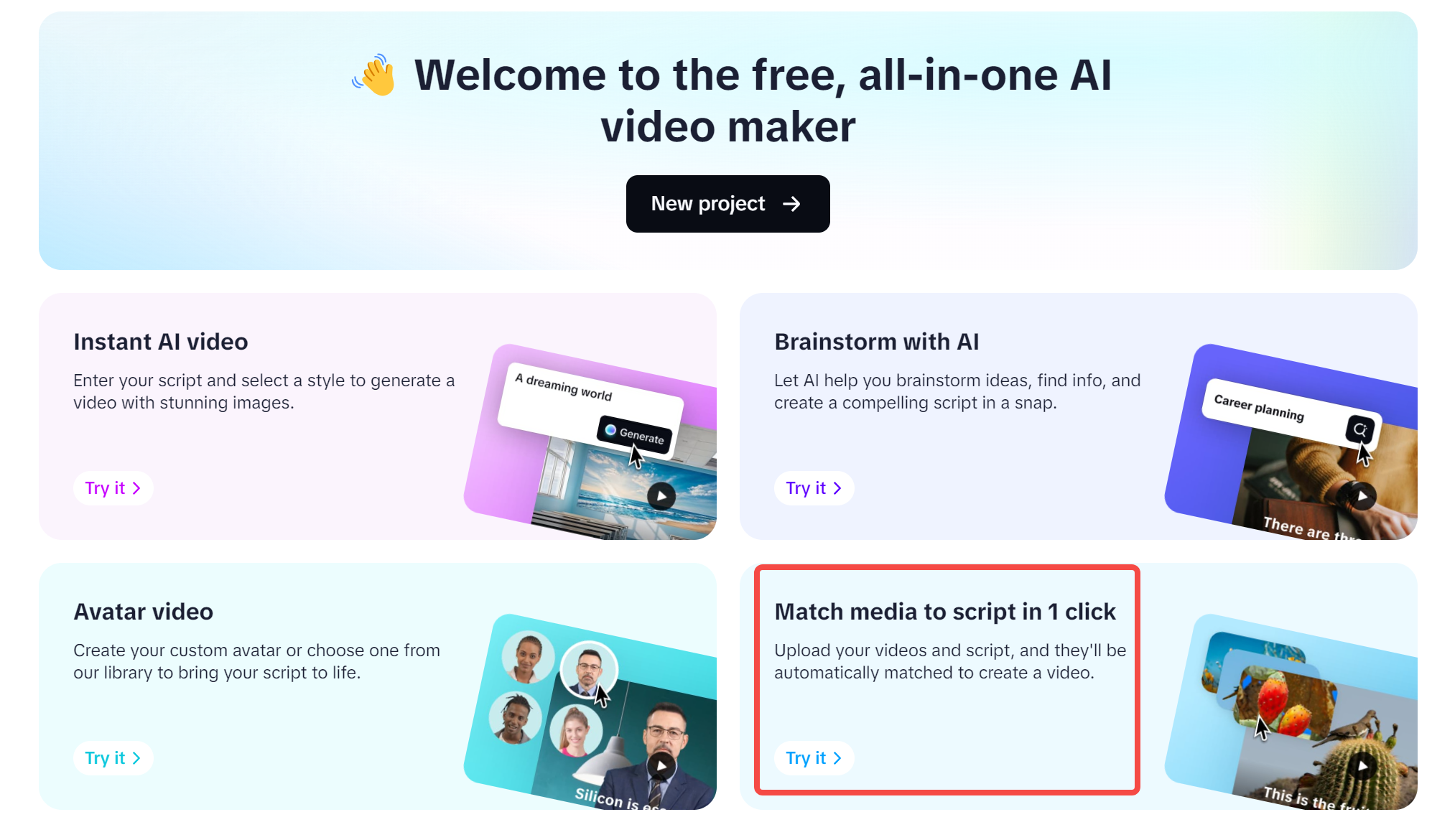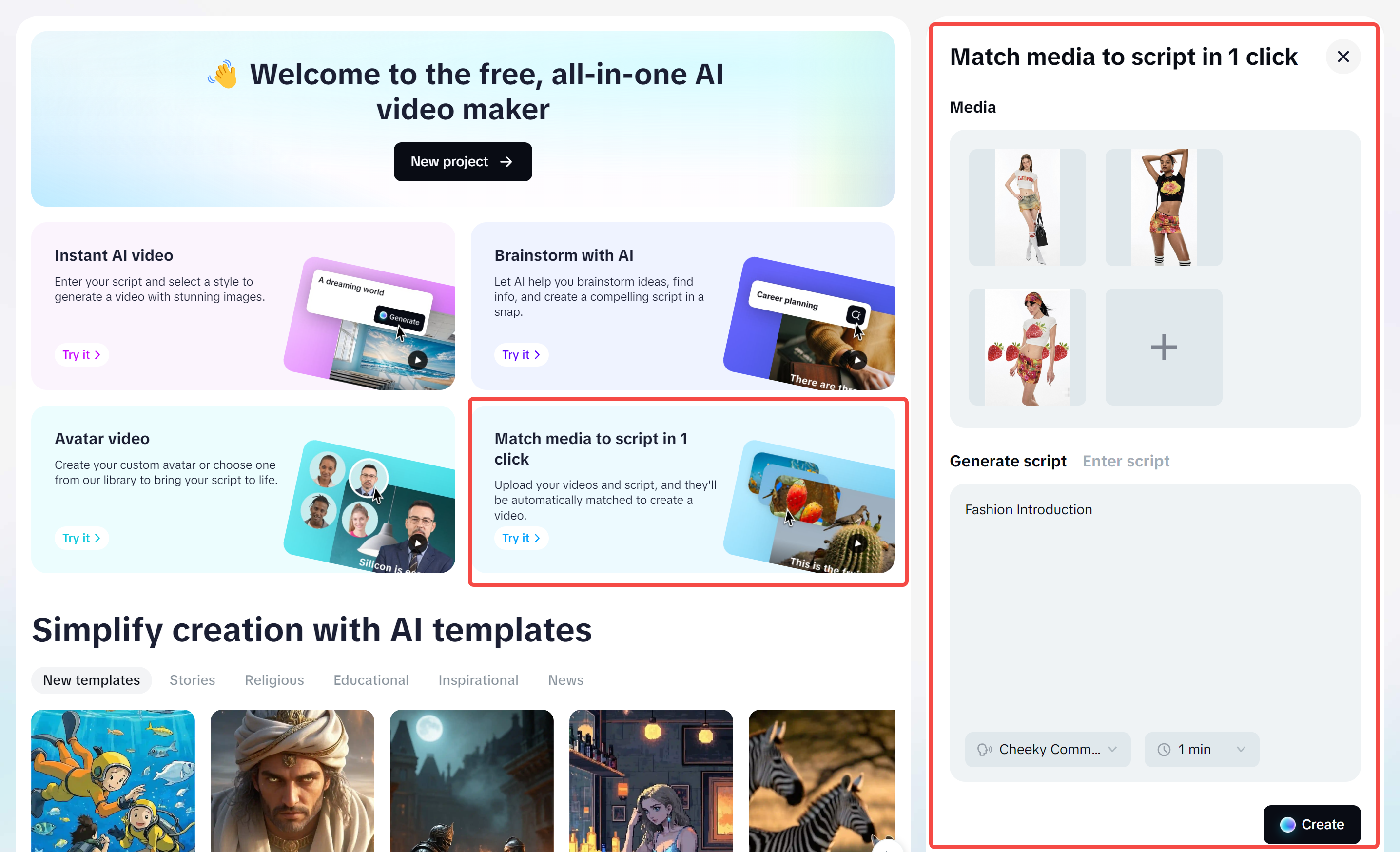 Inicie CapCut Web e selecione "Criador de vídeo gratuito IA " na interface principal. Em seguida, escolha a opção "Combinar mídia com script em 1 clique" para começar a transformar suas imagens em um vídeo.