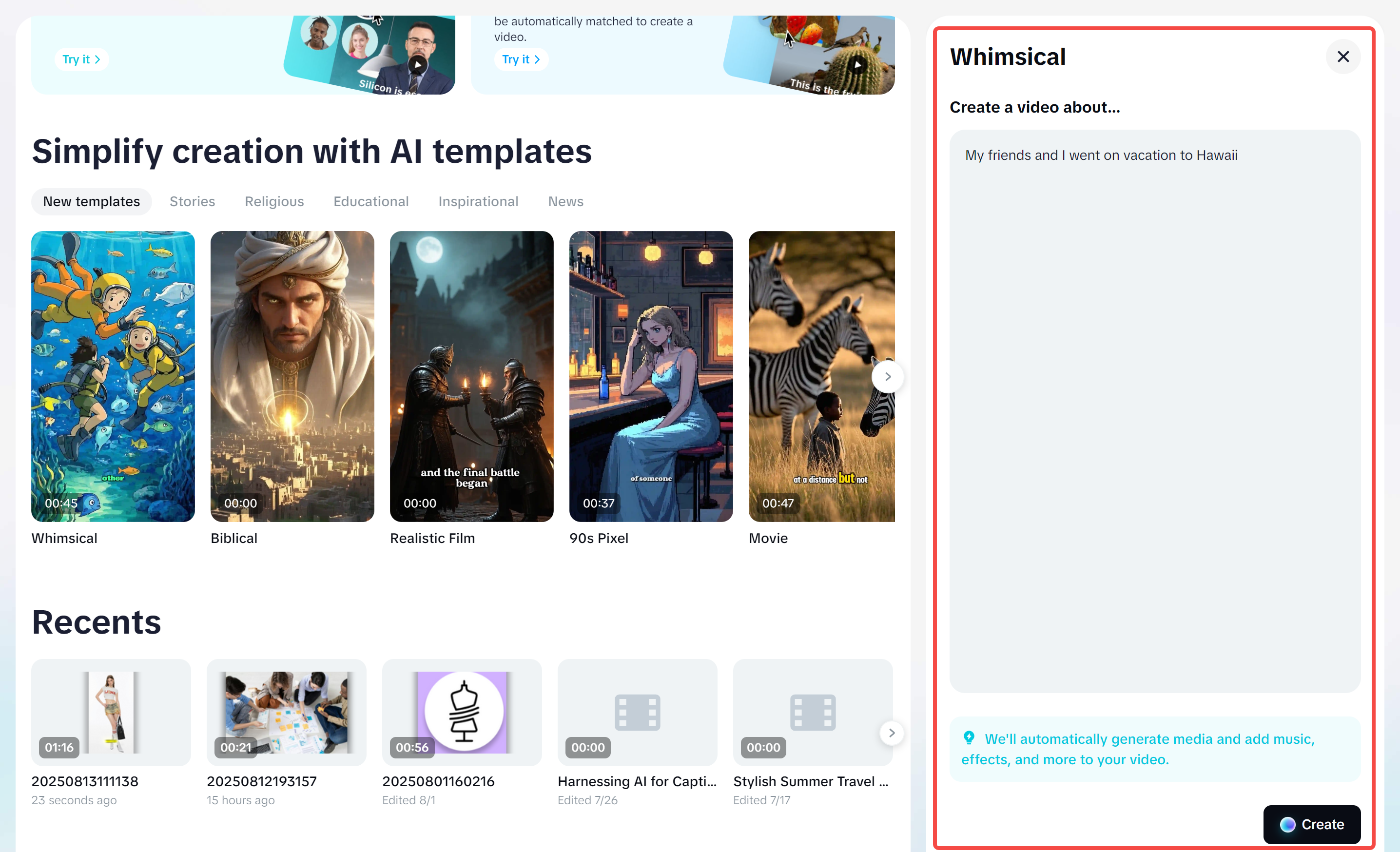 Digite seu prompt descrevendo como deseja personalizar o vídeo e quais elementos deseja incluir. Clique em "Criar" e o CapCut gerará automaticamente a mídia, adicionando música, efeitos e muito mais.
