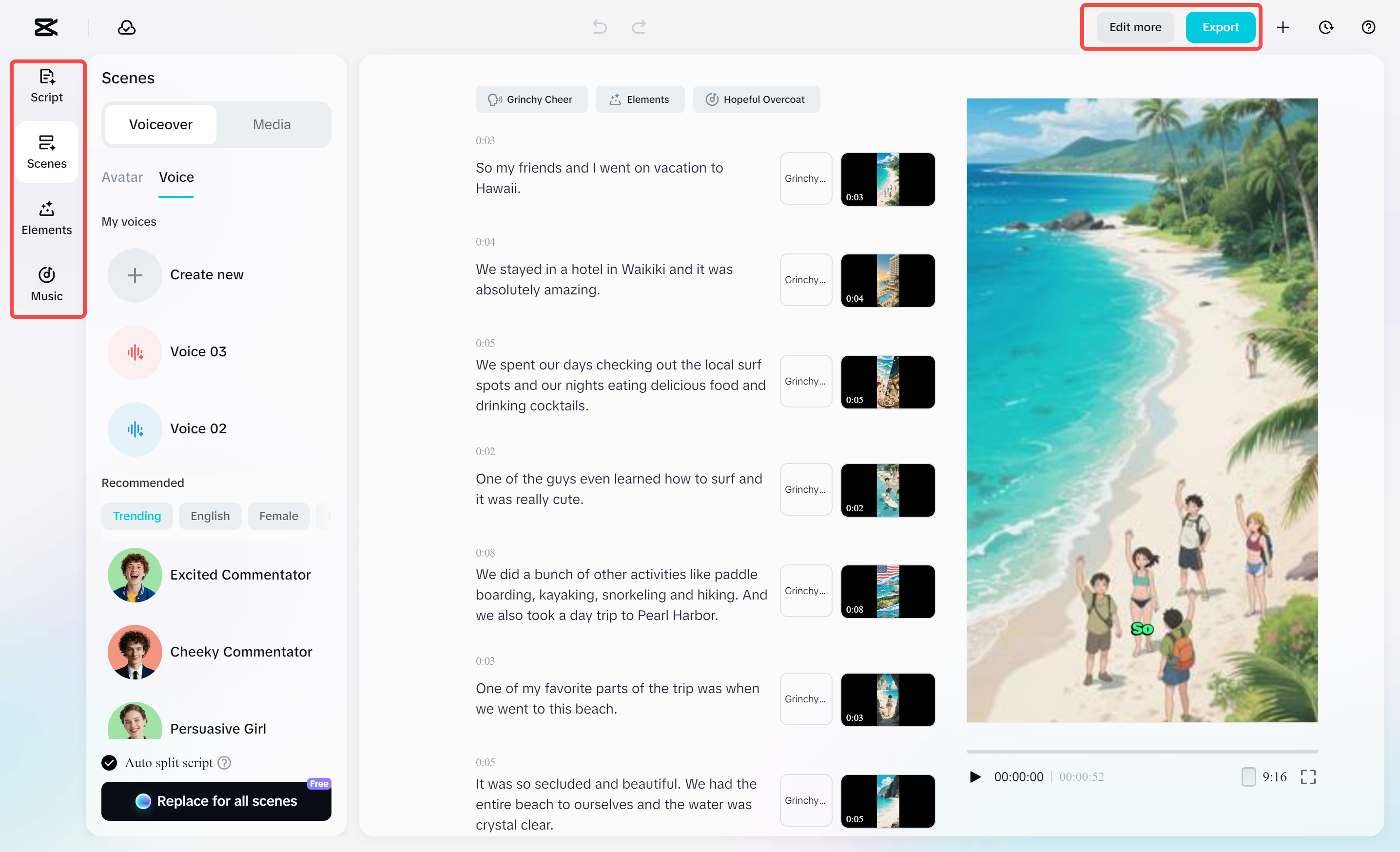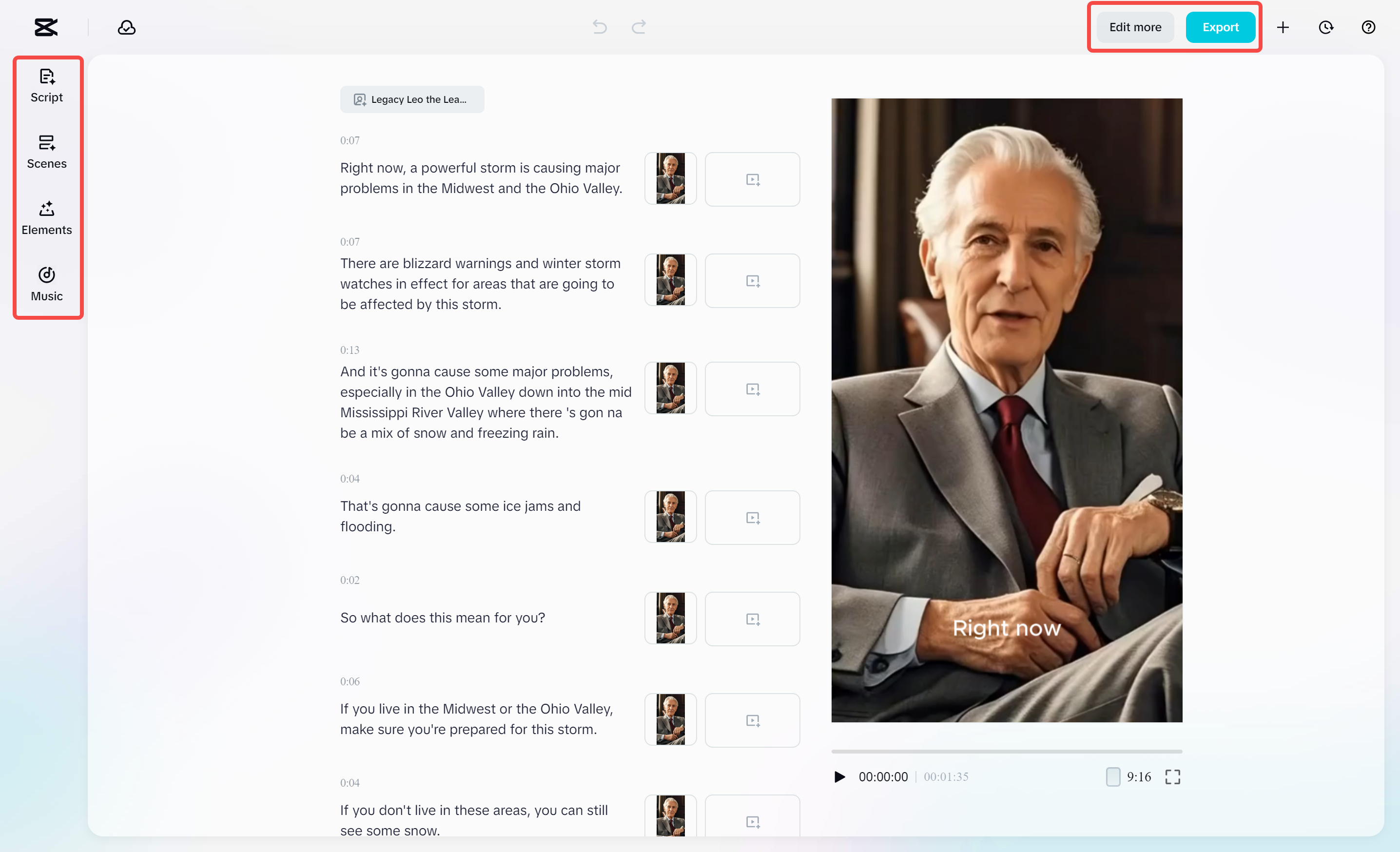 Depois que o vídeo é gerado, você pode personalizá-lo alterando a mídia, adicionando legendas, dublagens e outros efeitos. Quando estiver pronto, clique em "Exportar", escolha sua resolução (até 4K), qualidade e formato e clique em "Exportar" novamente para salvar seu vídeo.