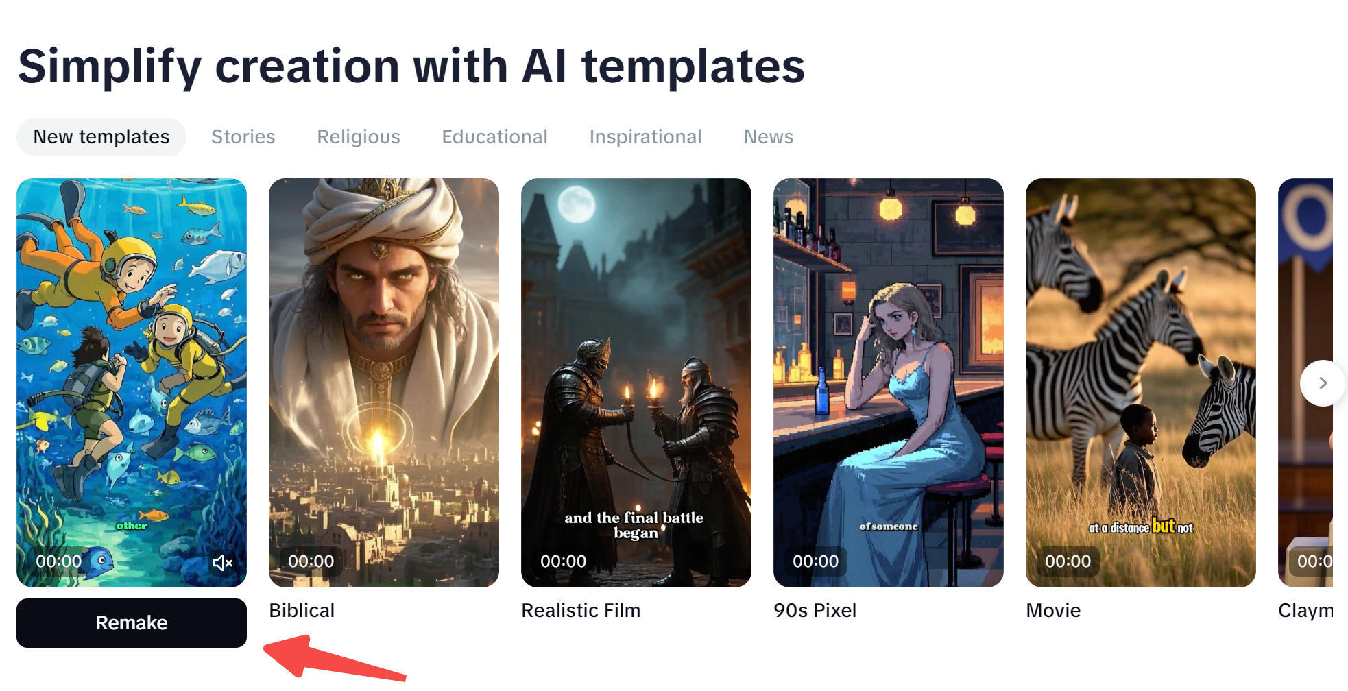 Na interface principal do CapCut, clique em "Criador de vídeo gratuito IA " e role para baixo para explorar os modelos disponíveis. Depois de encontrar um de que goste, clique em "Remake" para começar a personalizá-lo.