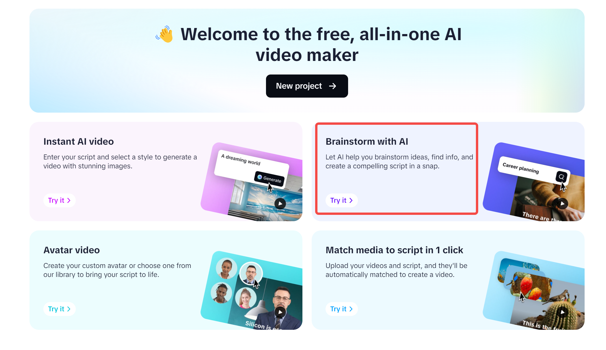 Abra CapCut Web, clique em "Criador de vídeo gratuito IA " e selecione "Brainstorm com IA" para iniciar a interface do mapa mental.