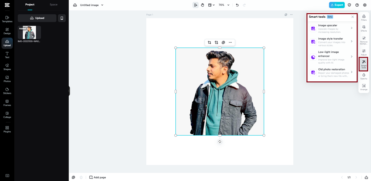 A função "Ferramenta inteligente" exemplifica a inventividade CapCut; é uma ferramenta dinâmica que se destina a fornecer os melhores resultados. Com a ferramenta inteligente, as complexidades da imagem são levadas em consideração, permitindo a preservação de elementos importantes e composição. Se você está procurando por ferramentas inteligentes em vez de apenas modificações de tamanho, isso é uma virada de jogo. Com recursos como restauração de fotos antigas, intensificador de imagem com pouca luz, transferência de estilo de imagem CapCut Online é um oponente formidável no campo da melhoria da imagem. Leve o dimensionamento da sua imagem para o próximo nível com CapCutrecursos de ponta. Não só seus arquivos se encaixam perfeitamente nas proporções especificadas, mas também ficarão deslumbrantes.