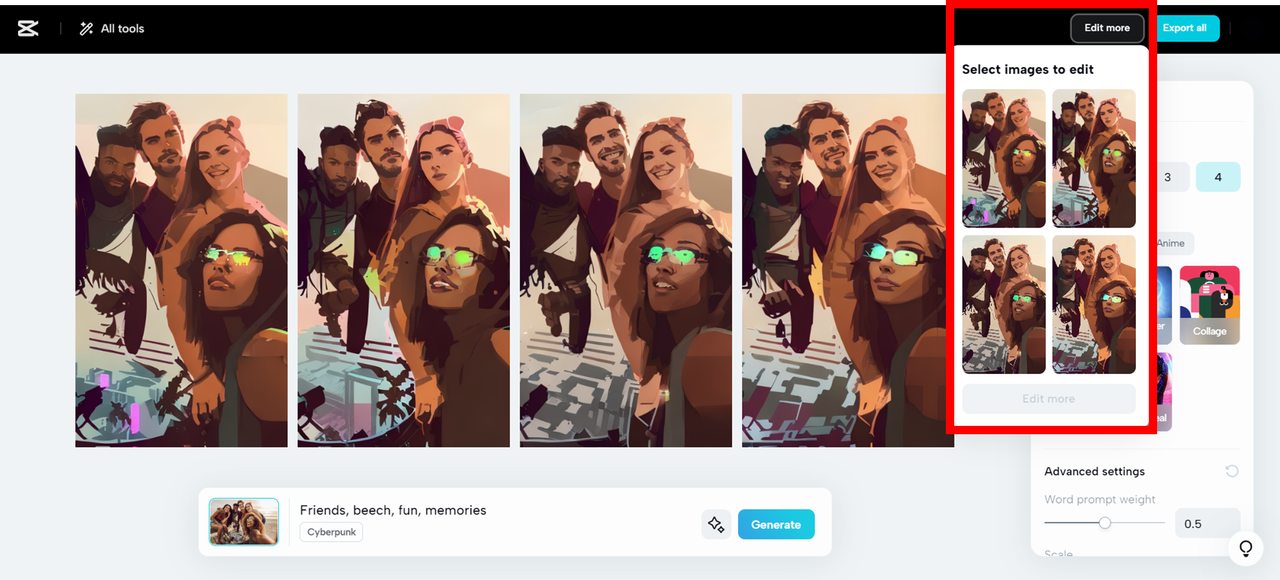 À medida que você gera retratos de mangá, CapCut permite que você estilize e edite a selfie de arte em Editar mais opções. Isso o levará a uma interface de edição online.