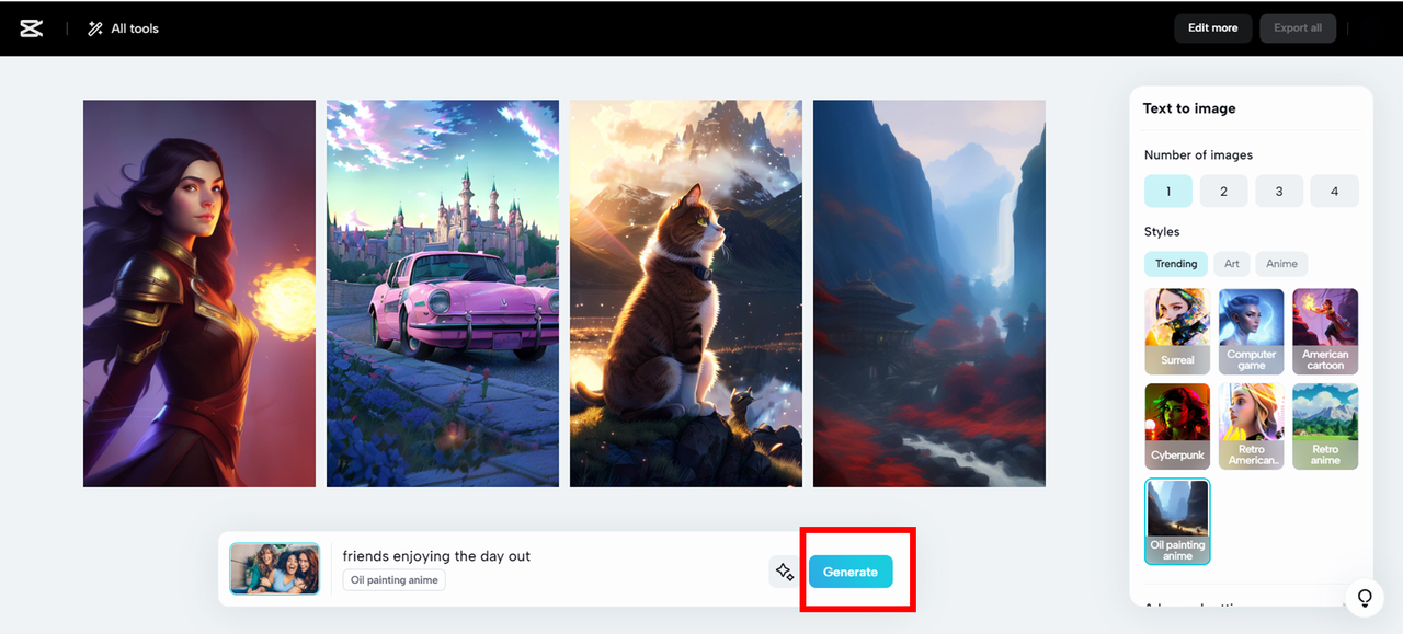 Além da ferramenta geradora de mangá de IA de imagem para imagem, CapCut também oferece outra ferramenta de IA para alterar seu texto em retratos de mangá por meio de texto para imagem. Funciona com base no princípio dos prompts de palavras e os transforma em imagens de mangá. Você pode personalizar as configurações de saída como antes. E aqui está o que esperar mais!