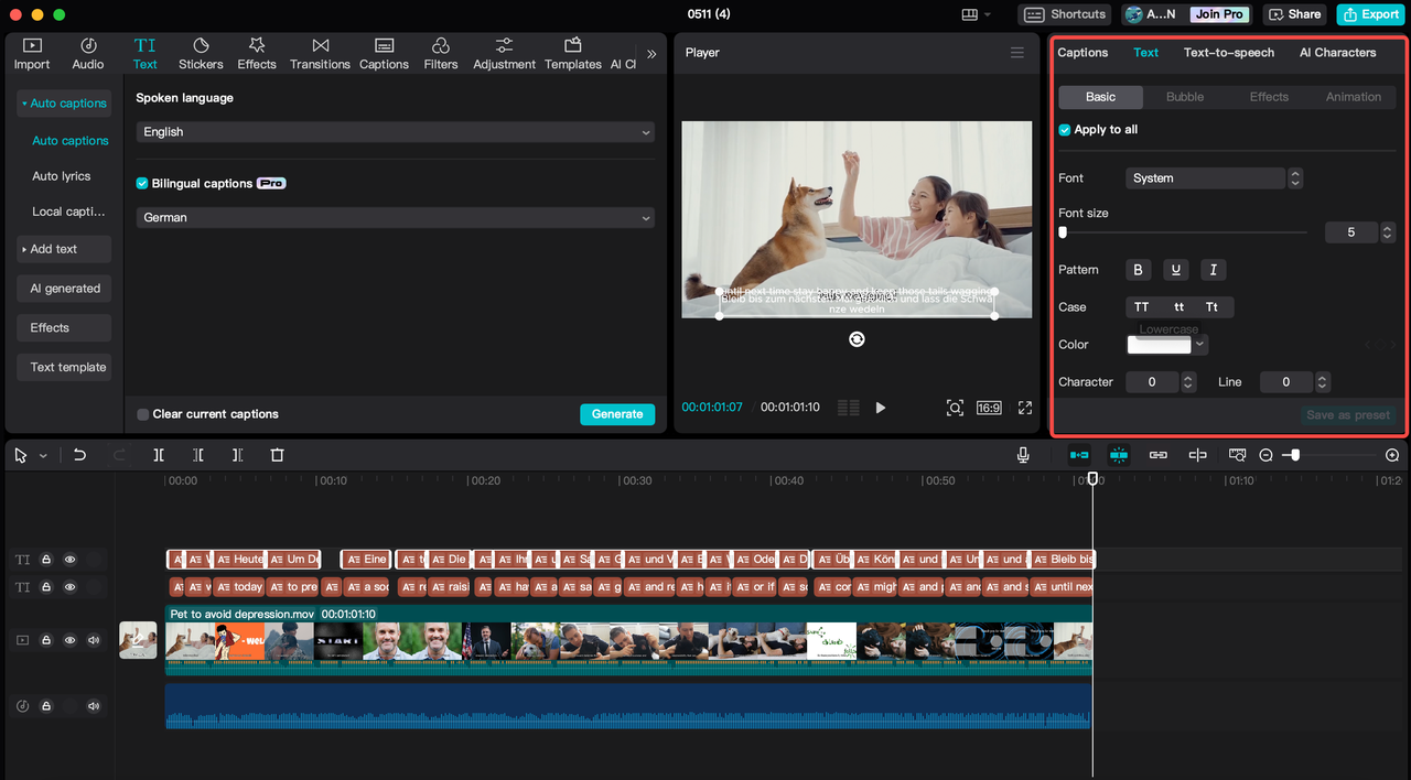 Depois que as legendas traduzidas são geradas, você pode personalizá-las como quiser. Vá para "Legendas" no painel direito para editar manualmente o texto da legenda. Você pode alterar o tamanho da fonte, estilo, caixa, cor, espaçamento, posição e muito mais na seção "Texto". Como alternativa, aproveite os modelos de texto. Você também pode usar IA modelos de texto para gerar seu estilo. Além disso, selecione a guia "Animação" no painel direito e clique em "Legendas" para animar cinematograficamente suas legendas. Você pode aplicar efeitos variados às legendas. Basta selecionar um clipe de legenda da linha do tempo para editá-lo sem afetar as outras legendas.