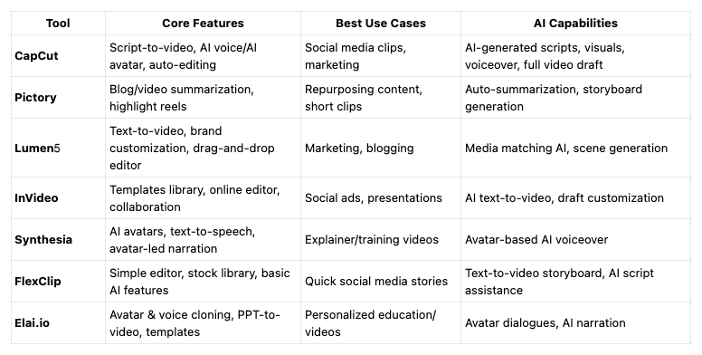 Here's a side-by-side overview of each AI video tool, highlighting core features, AI capabilities, and ideal use cases.
