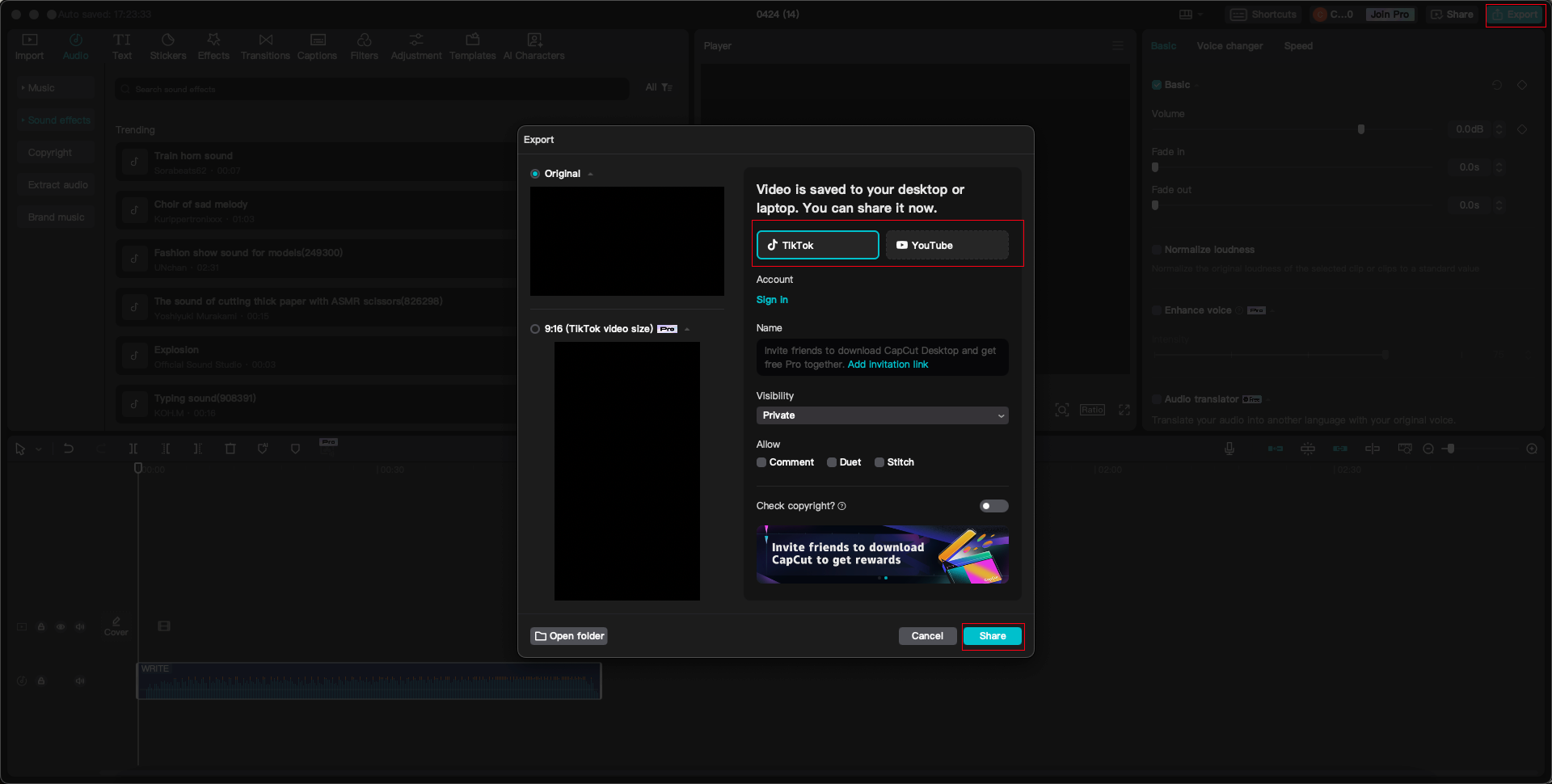 - Cloud space and team collaboration: Save projects in your CapCut cloud space for easy cross-platform access and allow simultaneous music editing by colleagues.