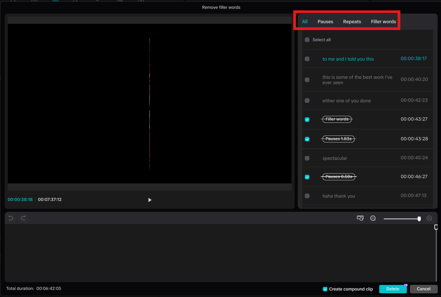Note that this function also allows you to identify pauses, repeats, and move filler words. After recognition is complete, CapCut automatically display this interface, allowing you to adjust the text according to your personal needs.
