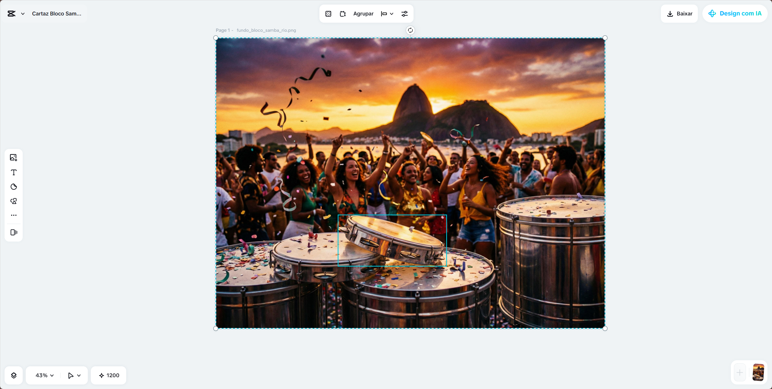 · Example Prompt 1: "Background for a samba bloco poster in Rio de Janeiro at sunset, with happy dancing people, tambourines and bass drums in the spotlight, colorful confetti in the air, realistic photography style with saturated and vibrant colors, warm lighting."