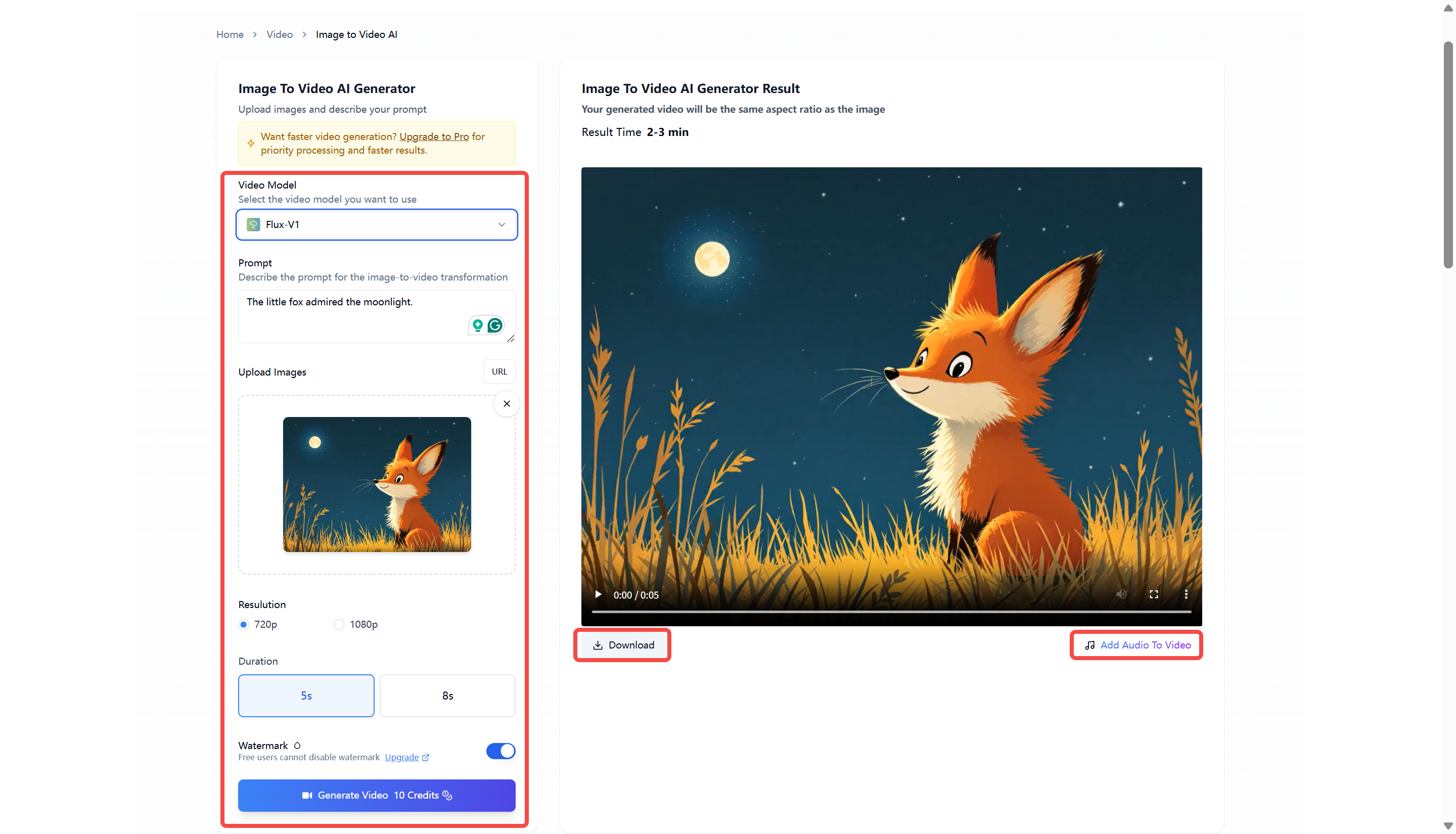 Select the Flux-V1 video model and describe the scene transformation in the prompt box—for example, "The little fox admired the moonlight."