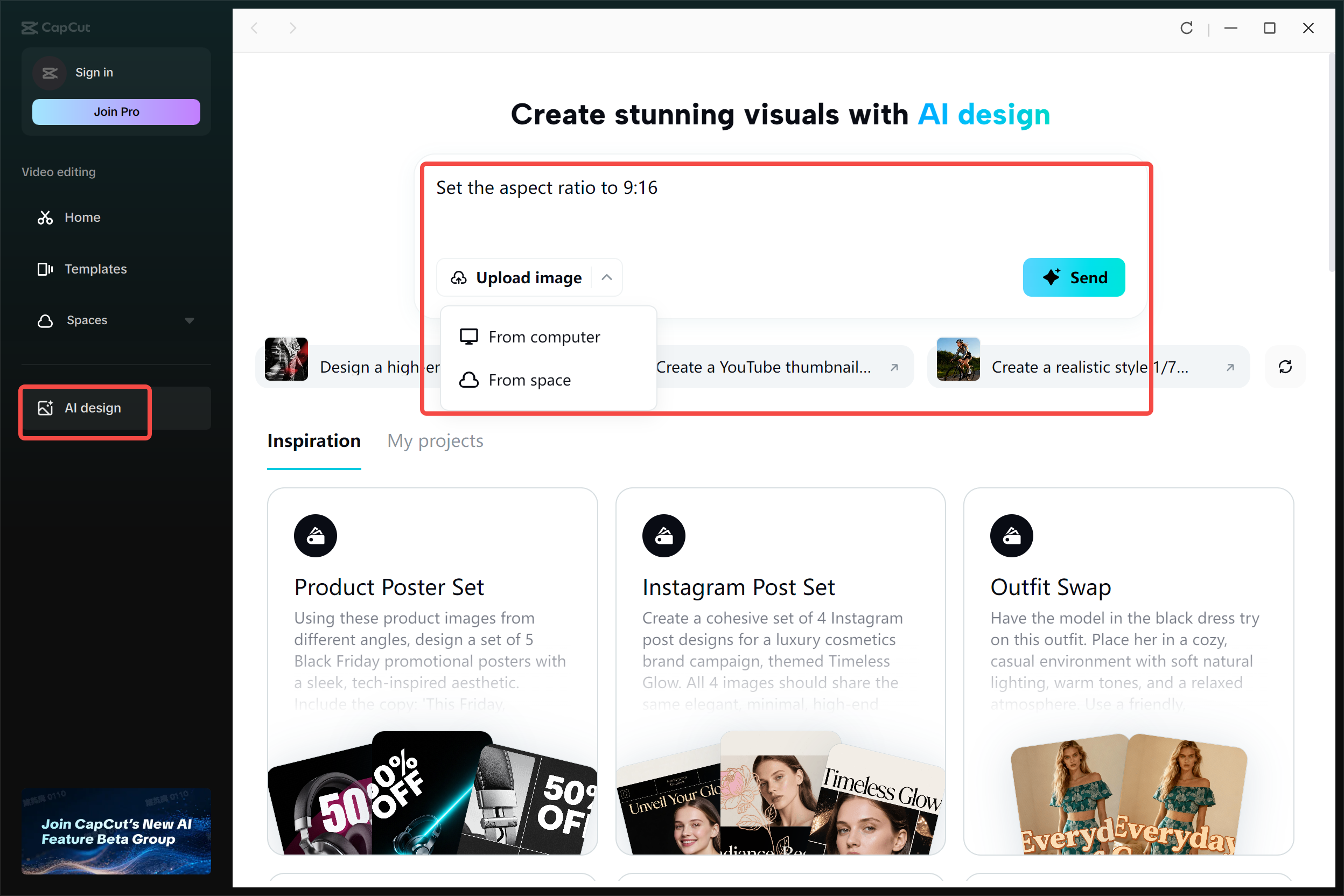 Open CapCut and select "AI design" from the left sidebar. Then, navigate to the "My projects" section and click "Create image" to upload your image for editing.