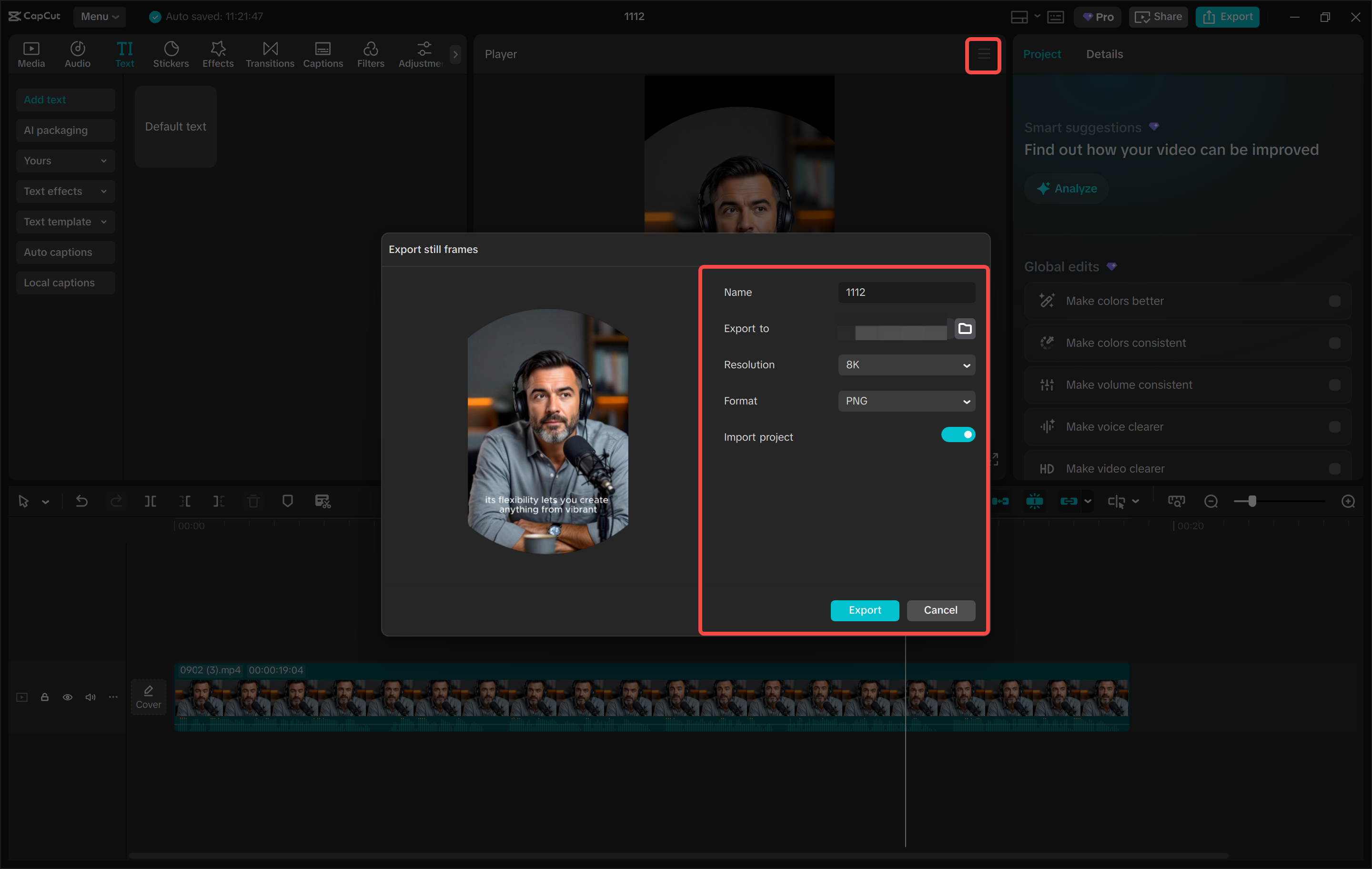 - Enter a project name, select the desired resolution (e.g., 4K or 8K), and click "Export."