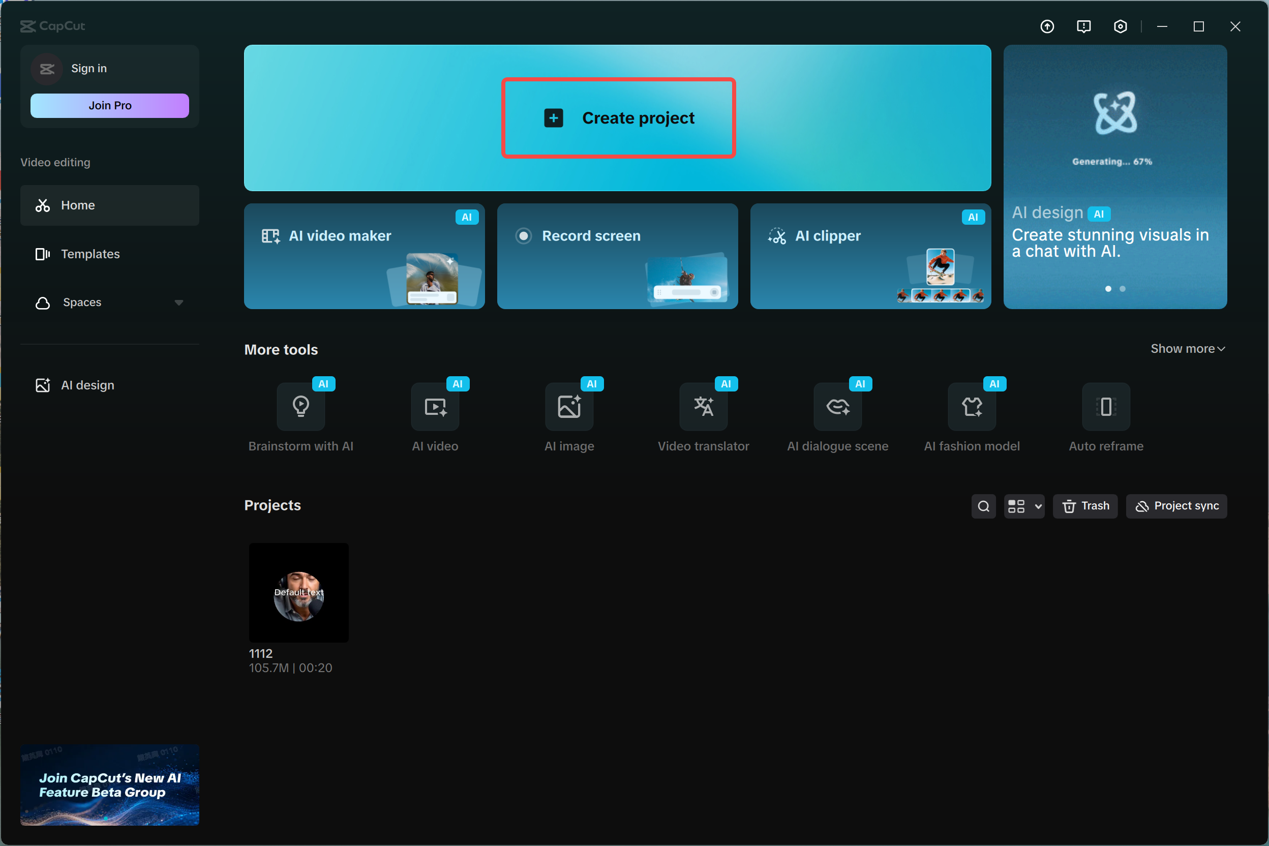 - Open CapCut and click "Create project."