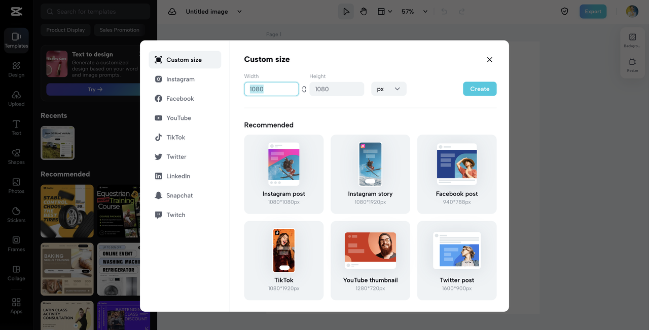 Head over to CapCut's graphic editor and select the image size.