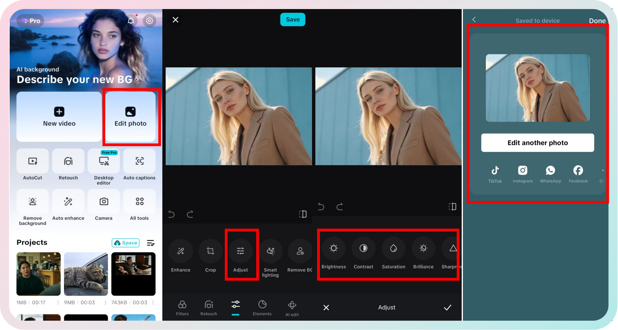 Method 1. Upload, send an AI prompt ("make it less blurry, keep natural"), then export. If the result looks harsh, run one quick follow-up prompt to reduce oversharpening. Also, use the "Intelligent Design" on your phone has the same effect.