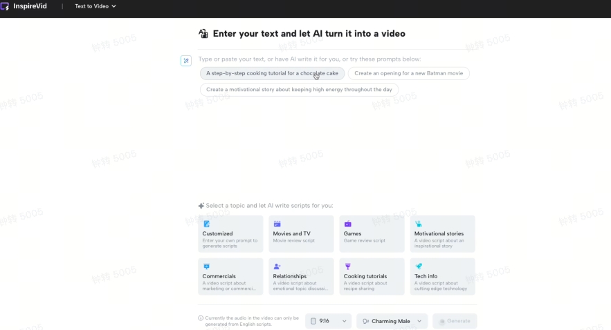 Visit InspireVid and utilize our Script-to-Video Converter through your web browser. Choose 'Narration' to develop conversational scripts or 'Commercial' for promotional material. Input your prompts manually or select from a range of pre-generated options provided by our AI writer.