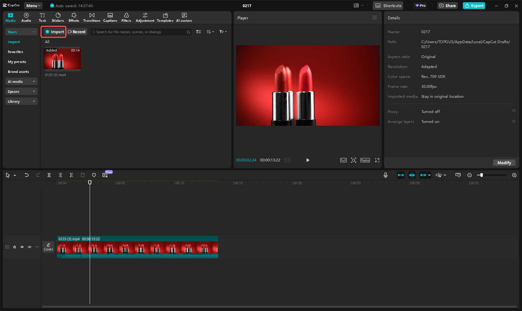 Start a new project in CapCut and click "Import" to upload your product media file, like images, videos, or audio, from your computer, device, or cloud storage. CapCut supports various media formats, making it easy to bring in your footage.