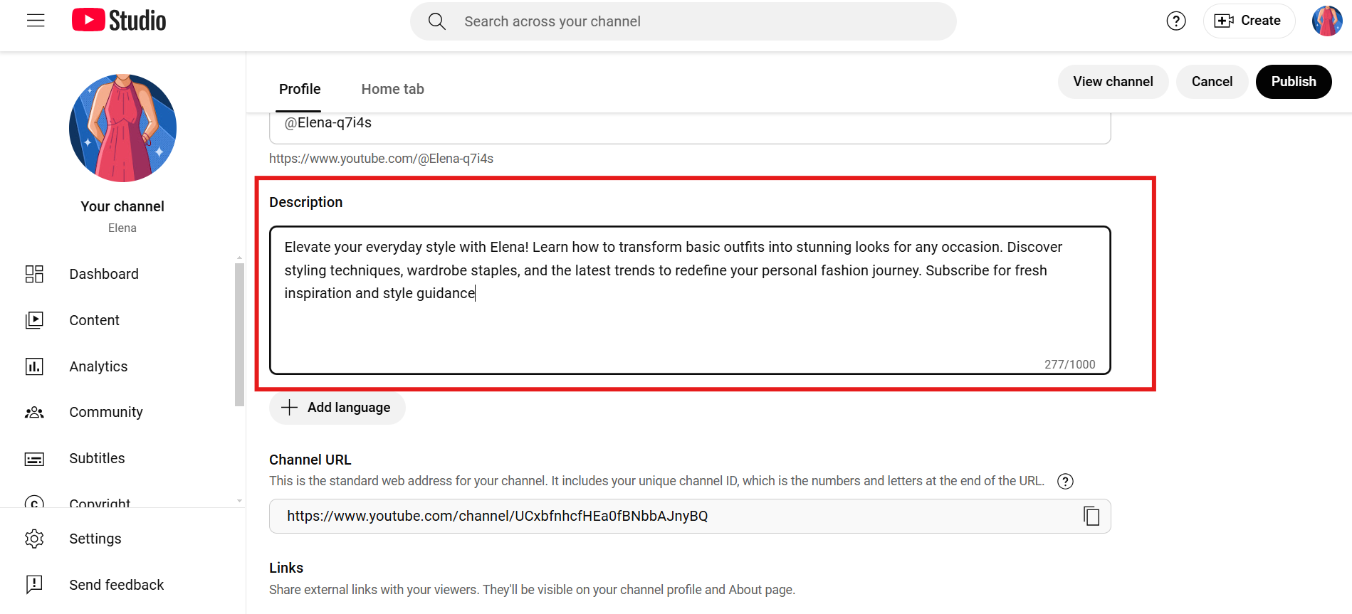 Now, go to the "about" section of your channel and provide pertinent details. There, you must add a description with keywords. Optimize the description to capture the search terms. Also, add links to your channel as well as your contact details (email address).