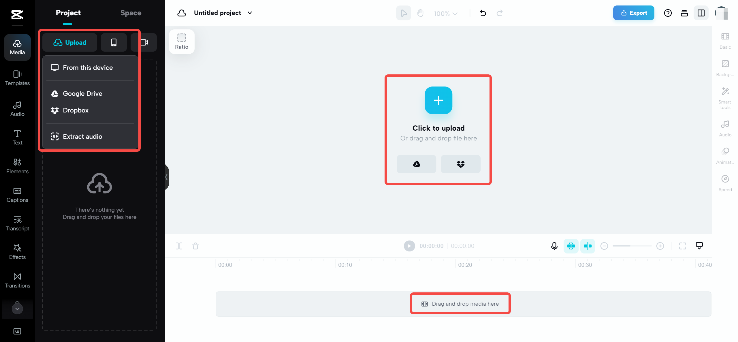 คลิกที่เว็บไซต์ของCapCut หรือค้นหาบนอินเทอร์เน็ตได้อย่างง่ายดายด้วยการพิมพ์ลงบนเครื่องมือค้นหาใดๆ เมื่อคุณอยู่บนเว็บไซต์ ให้เลือกผ้าใบเปล่า อัปโหลดวิดีโอผ่านอุปกรณ์หรือที่เก็บข้อมูลบนคลาวด์ของคุณ แล้วลากไปที่เมนูแก้ไข ทำซ้ำขั้นตอนสำหรับการอัปโหลดวิดีโอทั้งหมดที่คุณต้องการรวม