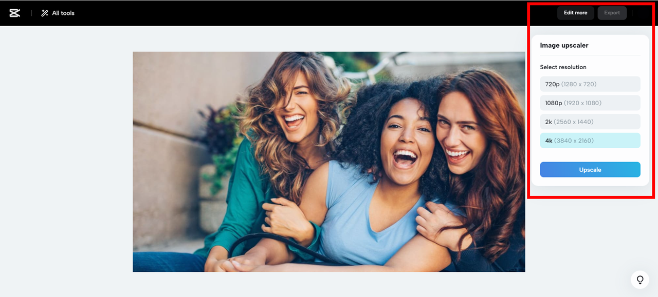 Kapag tapos na sa pag-upscaling at pag-edit, ang huling hakbang ay i-export ang larawan. I-click ang I-export upang i-download ang larawan sa lokal na imbakan o ibahagi ito sa mga platform ng social media tulad ng TikTok, YouTube, Facebook, at Instagram.