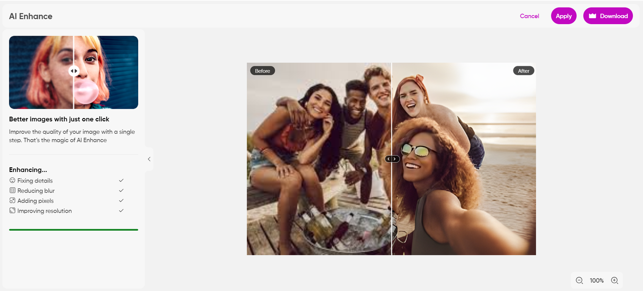 Nakatuon ito sa mga menor de edad na detalye, pinahihigpit ang mga gilid, at pinahuhusay ang resolusyon ng imahe, ibig sabihin, nagko-convert ng isang imahe na may mababang resolusyon sa mga de-kalidad (hanggang sa 4k) na mga larawan na handa nang social media. Maaari mong ituon ang mga malabong detalye sa background sa pamamagitan ng pagpili ng resolusyon ng imahe mula sa preset ayon sa mga kinakailangan sa social media.
