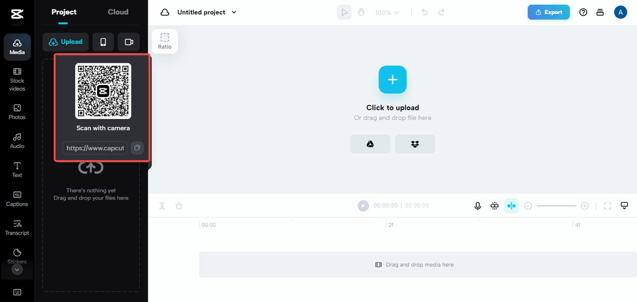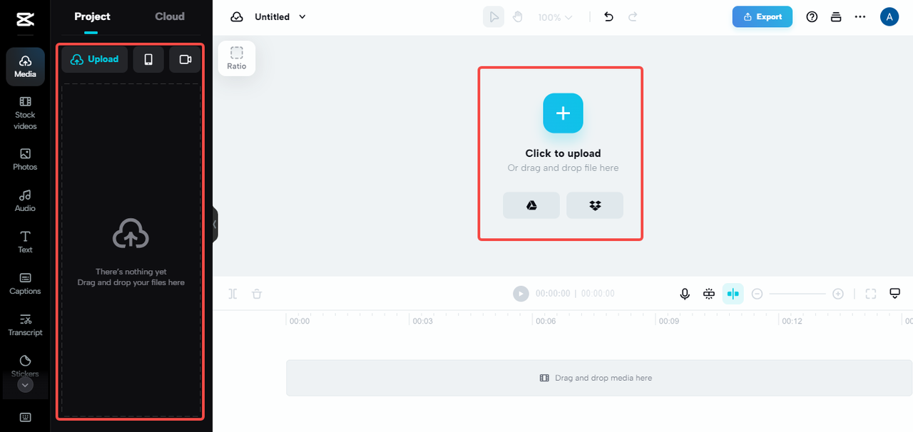 Videoları cihazdan, Google Drive 'dan, Dropbox' tan veya bulut alanından zaman çizelgesine CapCut almak için sol panelde "Yüklemek için tıklayın" seçeneğine dokunabilirsiniz. Ayrıca, dosyaları sol panele veya merkeze sürükleyip bırakmayı deneyin.