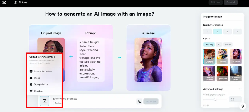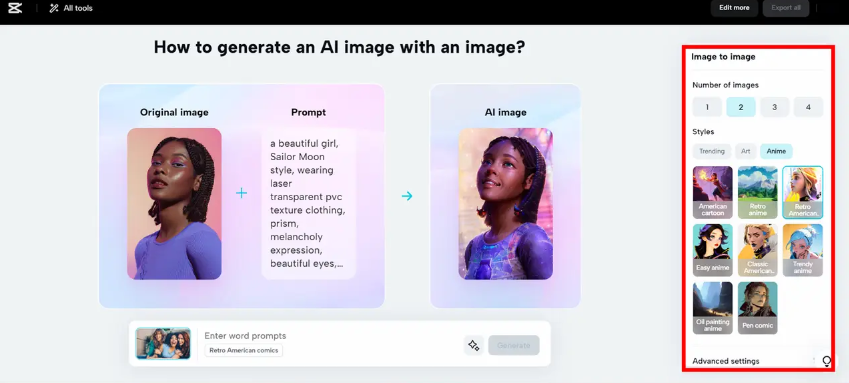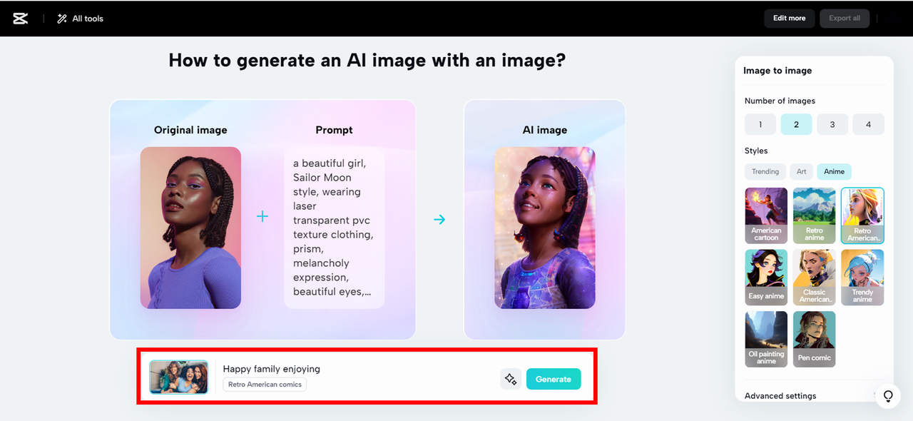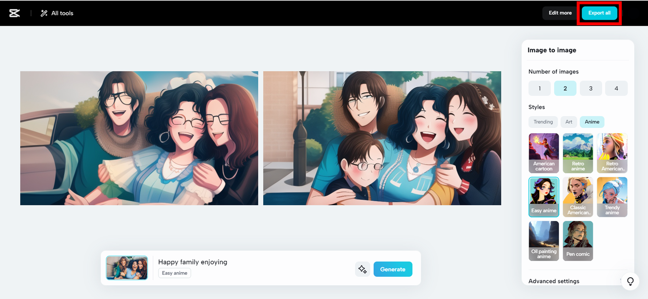 Тепер ви можете перетворити фотографії на незабутні аніме-сімейні фотографії та аватари за кілька кроків, використовуючи передові графічні інструменти, такі як Media.io, Fotor та інші. Крім інших онлайн-опцій, інструмент CapCut image to image спрощує процес створення аніме, надаючи власні фотографії в Інтернеті безкоштовно. Він надає різноманітну бібліотеку стилів із багатими шаблонами, що дозволяють миттєво перетворювати ваші фотографії на ваші улюблені аніме-сімейні портрети. Тим часом він пропонує вам доступ до ряду інших інструментів AI, таких як корекція кольору та видалення фону тощо. Спробуйте CapCut, щоб надати вашим звичайним сімейним фотографіям нові розміри в сімейному аніме з максимальною творчістю в один клік.