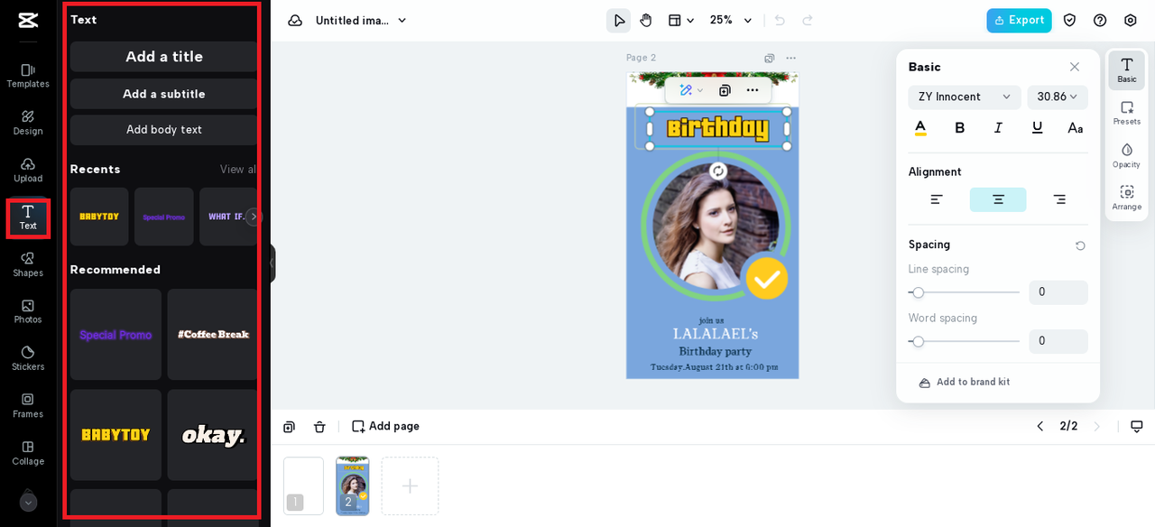 - Tùy chỉnh tờ rơi của bạn: Khi bạn đã chọn một mẫu, đã đến lúc cá nhân hóa nó. Thêm văn bản của bạn, bao gồm các chi tiết sự kiện như tên, ngày, giờ, địa điểm của người sinh nhật và bất kỳ thông tin bổ sung nào bạn muốn đưa vào. Bạn cũng có thể tải lên hình ảnh và áp dụng trang trí để tăng sức hấp dẫn trực quan của tờ rơi.